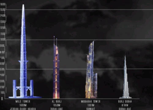 “王國(guó)大廈”(左,1600米)、迪拜大酒店(左二,1050米)、科威特穆巴拉克塔在(左三,1001米)、迪拜哈利法塔(右,818米)