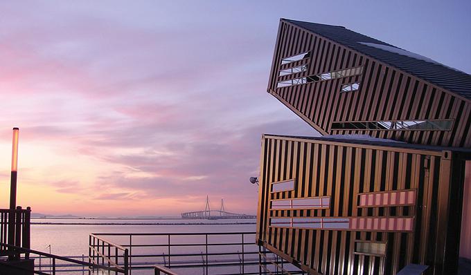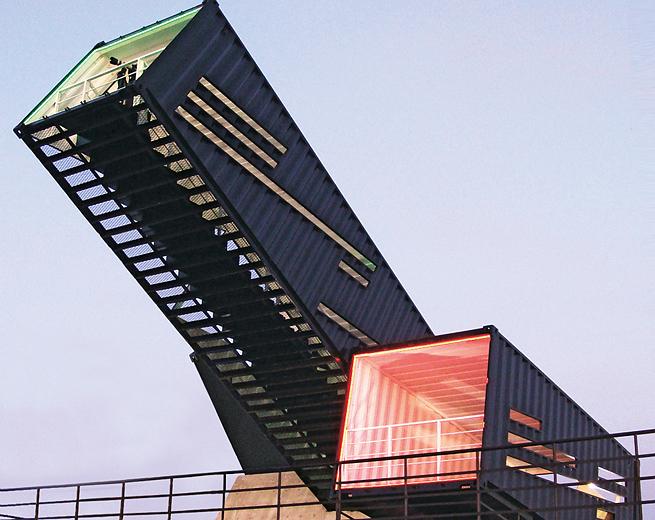 這個(gè)港口觀景平臺(tái)是由廢棄的集裝箱及其它可再循環(huán)利用的材料所構(gòu)建而成的。它與歷史名勝“日落城”毗鄰,位于韓國最大的港口城市之一仁川市。設(shè)計(jì)師把一個(gè)個(gè)色彩斑斕的集裝箱壘成各種幾何圖形的觀景平臺(tái),每個(gè)平臺(tái)都呈現(xiàn)出各自特有的夢(mèng)幻魅力。平臺(tái)的設(shè)計(jì)目的主要是用于觀景,尤其是可以讓人們欣賞港口的日落。因?yàn)榈仄骄€比較低矮,不利于直接觀看日落的緣故,觀景臺(tái)被特別設(shè)計(jì)成上仰的角度。這些觀景臺(tái)看起來就像一個(gè)個(gè)巨型的望遠(yuǎn)鏡。參觀者只要登上扶手樓梯,就可以透過不同的視角觀看日落的全部景色。