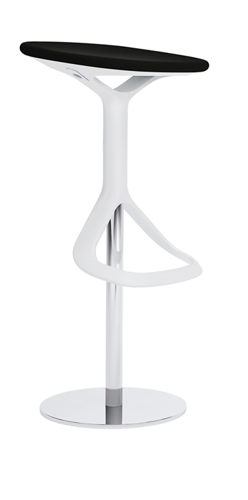 Lox invitingly seems to ask the guest to take a seat. A stable base carries the flowing forms of seat and footrest and is signalling cultivated pleasure. The swivelling bar stool is very comfortable and adapts to different sizes. The button for adjusting the height is completely hidden in the seat – an interesting stylistic detail. The materials used, as there are cast plastics in white, black or grey, chromium-plated steel, and the upholstered seats of Lox, complement each other to form a dynamic shape.