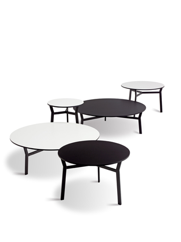 Sputnik’s concept is a functional and aesthetic combination of coffee and side tables in three different heights and diameters. All three tables feature three legs, which allows using them individually or in combination with each other. The smallest – and highest – table can therefore also serve as side table for a sofa or chair. The legs are made of lacquered steel, the tabletops of compact laminate with different colour options and finishes.