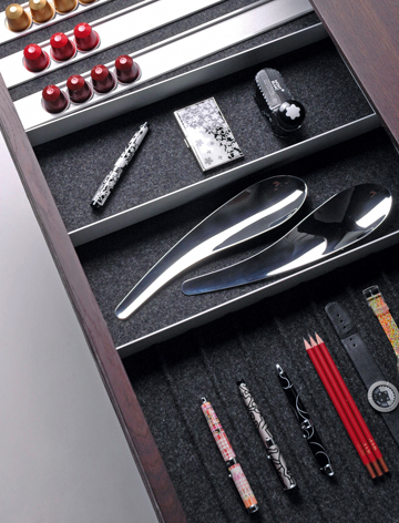 The Boxpur drawer interior add a high degree of aesthetic functionality to the interior of the furniture. Materials such as aluminium and fabrics like leather or silk are combined. Divisions are variable. The “iCompartment” for the proper placement of the mobile phone or iPod is an interesting detail.