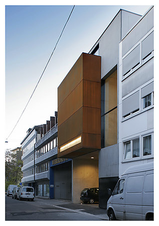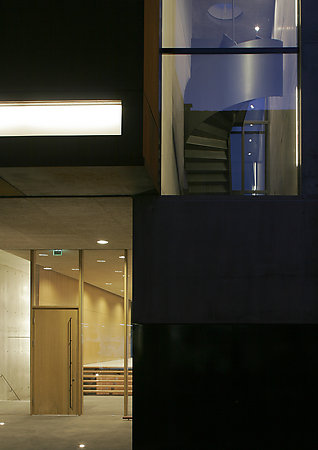 外墻,大面積的玻璃,清水混凝土和銹鋼板突出的銹紅鋼方體下面,是后退的,由透明玻璃覆蓋的入口。