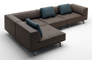 The Delphi product line consists of eleven modules offering a variety of individual sofa solutions. They can be used as classic chaise longue or, by turning the modules and adding a long seating upholstery, they turn into a seating furniture in traditional sofa format. Delphi is generously conceived and its construction displays an interesting dynamics emphasised by ingenious details. The asymmetry of the different seating depths is repeated at the backrests and armrests. This is inspiring not only for the whole body but also for the viewer’s eye. Solid cushions are made of visco-elastic foam and feature an eiderdown cover. The base frame is available in brushed chromium-plated steel or untreated oak.