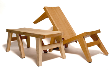 The Dong-Dong-Chiang is at the same time a wooden bench and a deck chair. In order to keep its balance and stability when folded two additional legs have been added to the originally four legs. Four pieces of solid wood have been glued together and then cut into two so that the piece of furniture can be folded. The curved part corresponds with the shape of the human body. Tenons joint the boards and the surface has been CNC-polished. The axle centre is made of steel to increase seating comfort and durability.