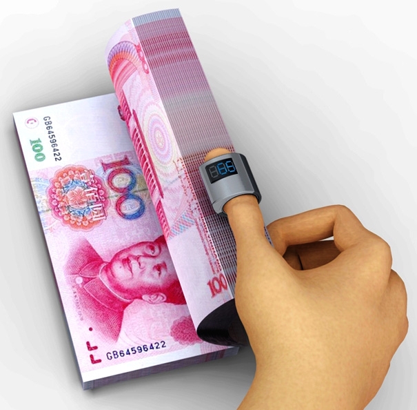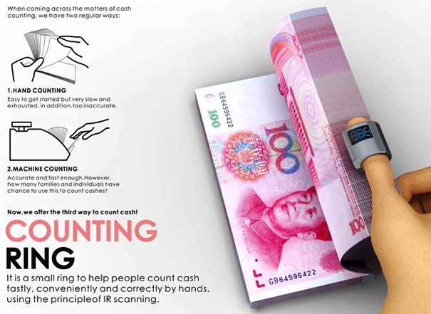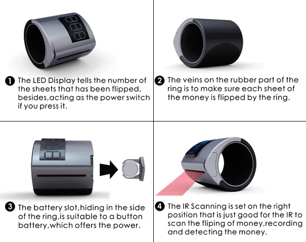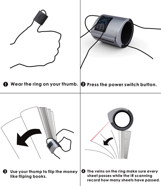 你只要將戒指戴在手上,將錢的一側(cè)從戒指處齊齊滑過,就可以結(jié)束拿那漫長煩躁的點鈔過程。