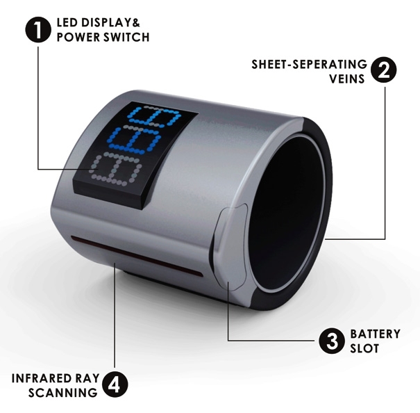 戒指有掃描功能,內(nèi)置led顯示屏,電源開關(guān),電池插槽和紅外線感應(yīng)裝置。