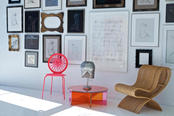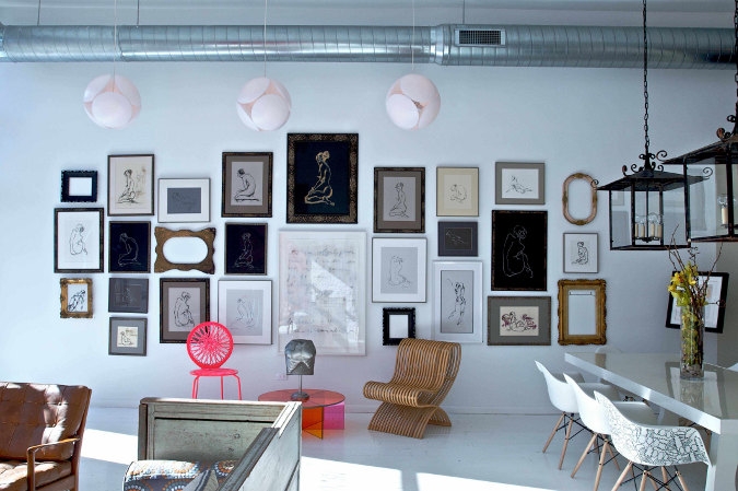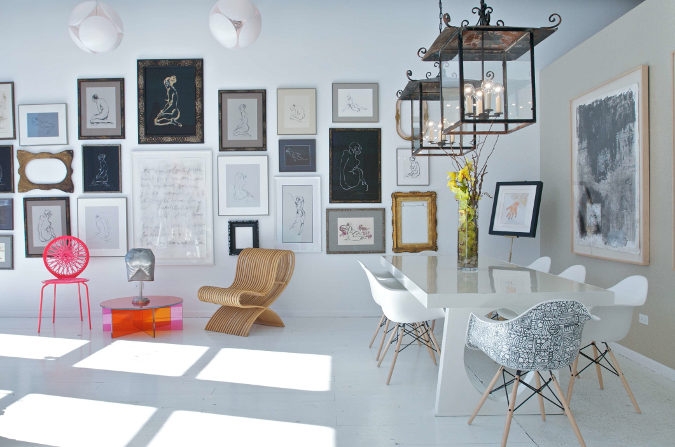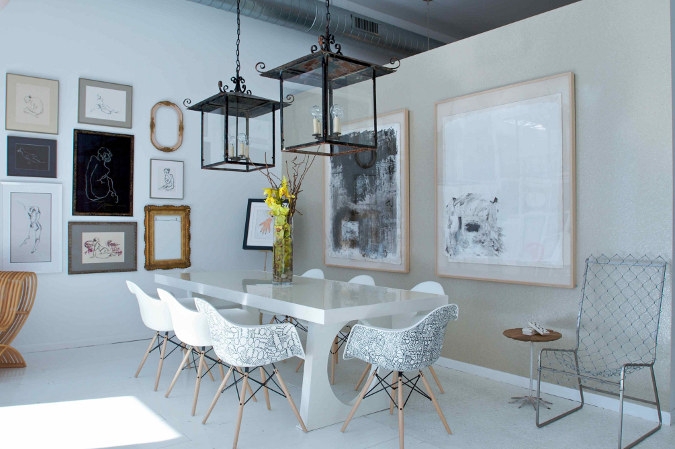 這是藝術(shù)家 Francine Turk的作品陳列室。他的繪畫作品被掛在墻上,整個房間的基調(diào)是白色,從地面,到墻面,到天花。各色各式家具被精心的放置在房間里,風格不相干,卻形成雅致的景象。特別是房間中的燈,非常漂亮,有中式的,洛可可式的,還有簡約式的,每件都是杰作,雖然他們有強烈的風格,但是在這里融合,完全就像是天作之合。