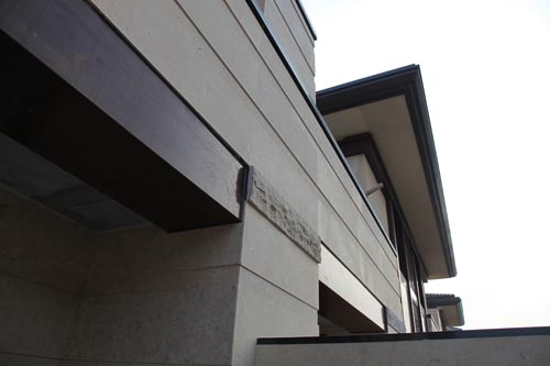 建筑立面風(fēng)格結(jié)合原有地塊上的植被情況,選擇了草原別墅風(fēng)格。四坡頂大挑檐的設(shè)計(jì),展現(xiàn)了舒展的建筑體量,與自然環(huán)境良好的融合。建筑體量變化豐富,基座厚重,風(fēng)格沉穩(wěn)大氣。建筑材料上主體墻面采用西奈珍珠貝,結(jié)合質(zhì)感涂料,檐口及窗套等重點(diǎn)裝飾部位采用木紋鋁板,整體用材以貼近自然為主,以期讓建筑更好的融入環(huán)境。