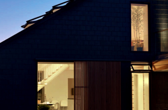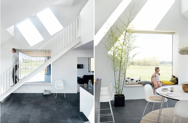 朝南的石板屋頂上放了太陽能發(fā)電系統(tǒng),太陽能熱水系統(tǒng),以及天窗。