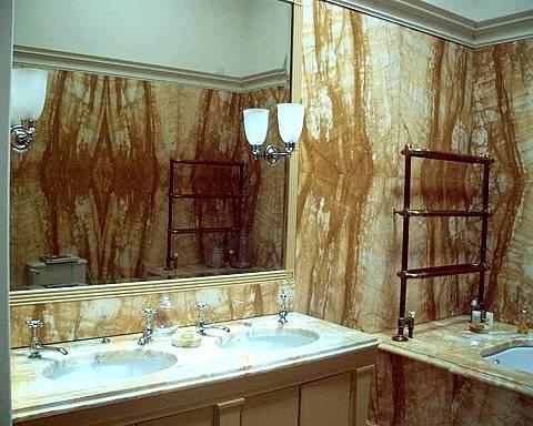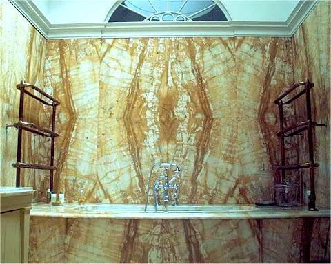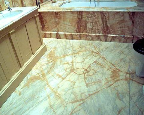 錫耶納麻是一種黃色的大理石,本案用于別墅衛(wèi)生間設計,衛(wèi)生間的地面和墻面大面積使用錫耶納麻,并充分利用這款大理石的自身的紋理變化進行拼花、對接,給人以無限的想象空間和藝術的動態(tài)美。這正是天然石材的魅力所在:足不出戶即可享受大自然的鬼斧神工。