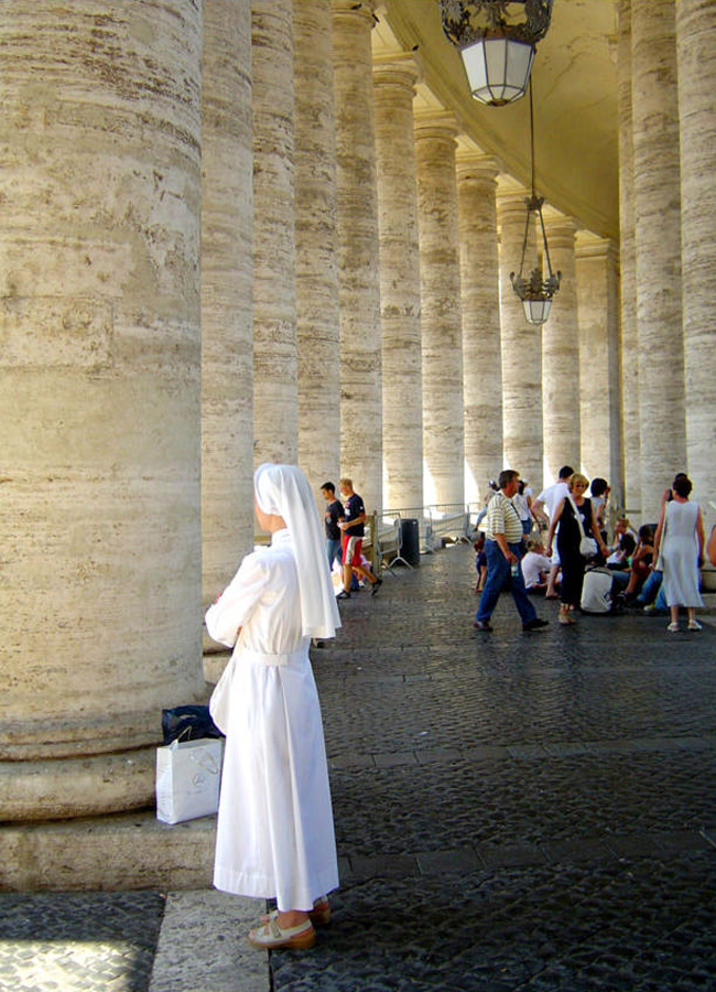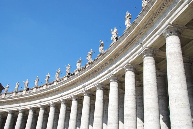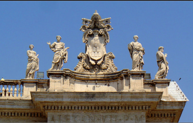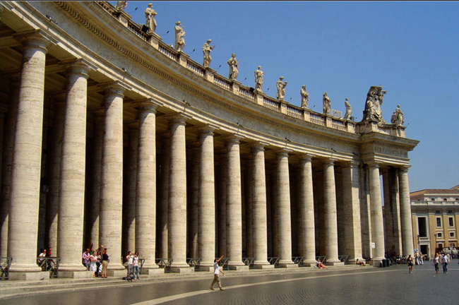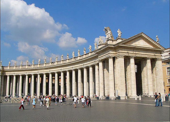 圣彼得教堂有兩個主題,一是教堂建筑本身,二是教堂前的圣彼得廣場。無論教堂還是廣場,都離不開兩個人的奉獻(xiàn),一個是圣彼得(Saint Peter),另一個是巴洛克建筑大師貝爾尼尼(Gian Lorenzo Bernini,歷經(jīng)12 年建成圣彼得廣場),圣彼得為信仰奉獻(xiàn)了生命,貝爾尼尼則為藝術(shù)奉獻(xiàn)了他的創(chuàng)造力,少了他們哪一個都不會有我們?nèi)缃窨吹降倪@座廣場。