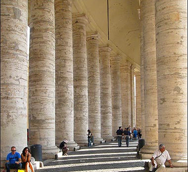 廣場被兩個半圓形的長廊環(huán)繞,由284 根高大的圓石、88 根方柱支撐著長廊,環(huán)抱在橢園廣場的兩邊。[page]