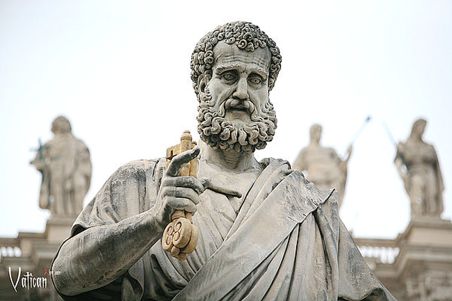 圣彼得雕像神情自若、面帶微笑,右手握著兩把 耶穌 送給他的通向天堂的金鑰匙,左手拿著一卷耶穌給他的圣旨。