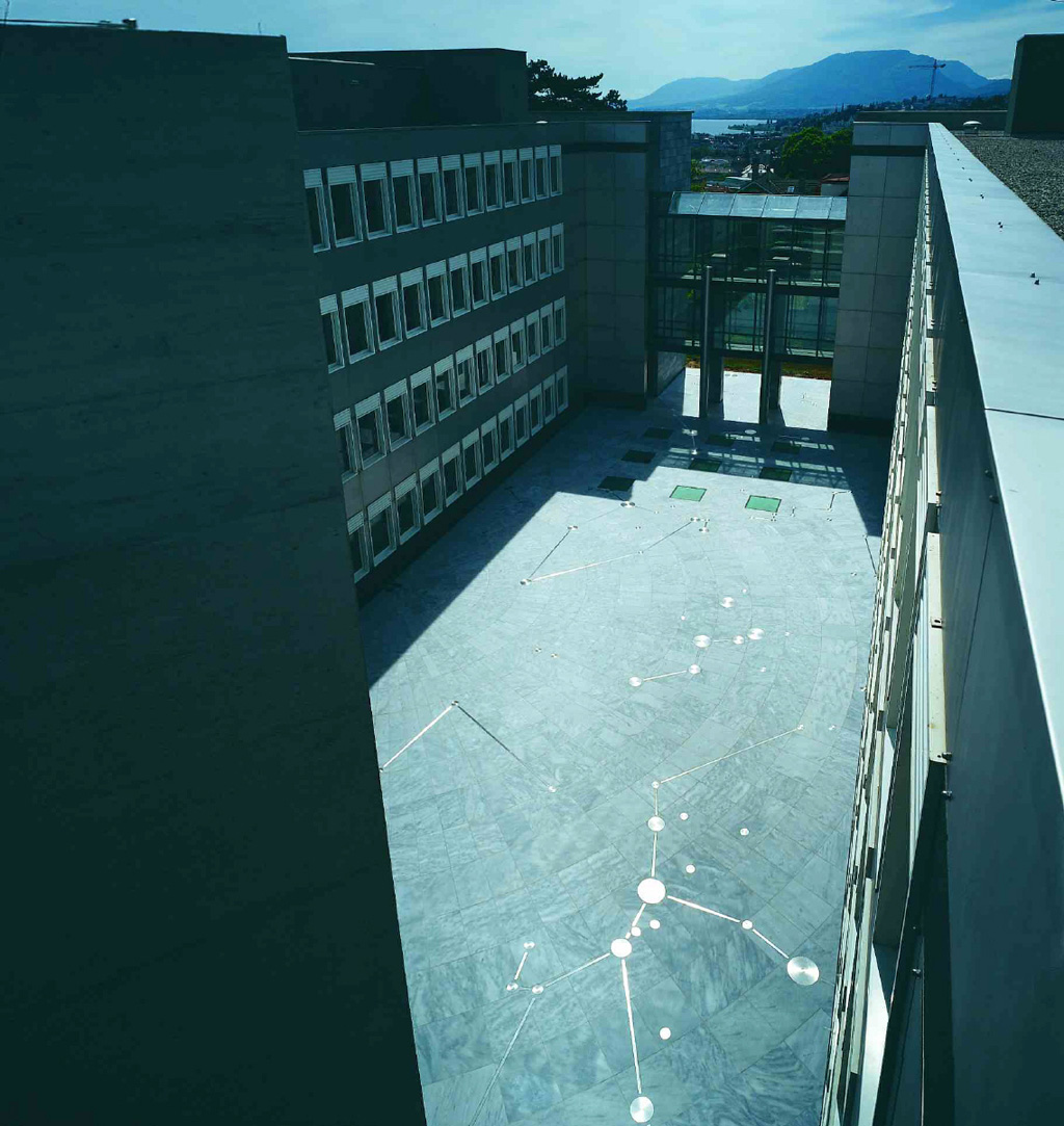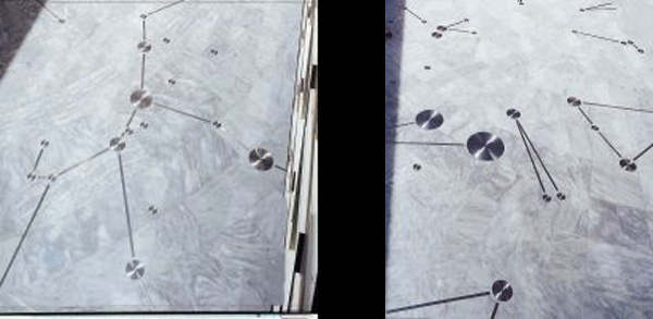 簡單描述: 在瑞士法語地區(qū)的Neuchatel市落成了一項(xiàng)巨大的工程,同時(shí)也是一件非常獨(dú)特的藝術(shù)品。由希臘Kaviros大理石和不銹鋼制成的這件藝術(shù)品,不僅對藝術(shù)家們的工作要求極其嚴(yán)格,而且對石材工匠的要求也非常高。 銀河系中既可在北半球、又可在南半球看到的抽象星座,以拋光過的近似圓形鍍鉻不銹鋼條的形式被鑲嵌在大理石地面上,其位置均符合各星座在天上的實(shí)際位置。 希臘Kaviros大理石。這種大理石顏色很淺,其條紋所產(chǎn)生的效果與有云彩的天空非常相似。 加工難度大:用激光切割出29個(gè)鋼件,運(yùn)往希臘的工廠。用機(jī)器徑向切割大理石板,板材彎曲的部分則用手工進(jìn)行加工,使之與鋼件的彎曲度吻合。在鋪設(shè)大理石板之前,需要用幾何方法來確定院子的長度軸線(經(jīng)線)。其方法是將經(jīng)緯儀放在代表南北天空的兩個(gè)極點(diǎn)上。在鋪設(shè)過程中,不斷地證實(shí)緯度 同心線與兩極間的距離。在現(xiàn)場混合攪拌、抹平灰漿。大理石板的背面也要抹一層灰漿。為了準(zhǔn)確,用手工來鋪設(shè)大理石板。 |