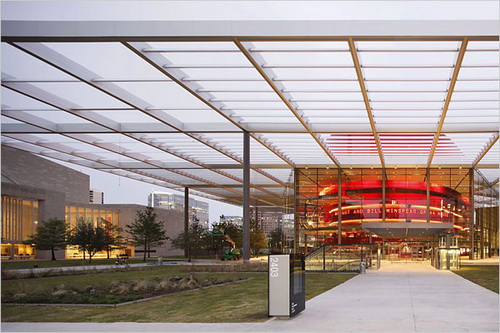 這個(gè)區(qū)域的最新建筑物,是前不久向公眾開(kāi)放的“威利劇院”(Dee and Charles Wyly Theater)和“溫斯皮爾歌劇院”(Margot and Bill Winspear Opera House)。它們面對(duì)這個(gè)地區(qū)的主要街道“弗洛拉街”(Flora Street)。它們強(qiáng)烈地表現(xiàn)了不同的設(shè)計(jì)風(fēng)格—— 一座是很酷的、試驗(yàn)性的現(xiàn)代建筑,另一座是有現(xiàn)代外表的傳統(tǒng)城市建筑。然而,它們共同給予這個(gè)藝術(shù)區(qū)以達(dá)拉斯長(zhǎng)期渴望的文化地位。