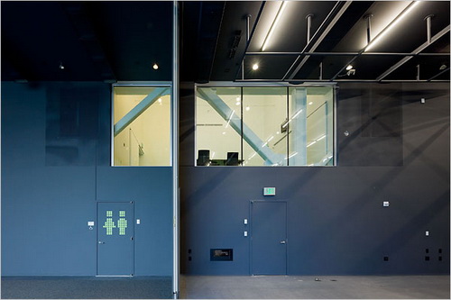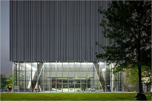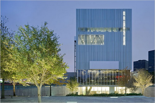 “威利劇院”距離“納西爾雕塑中心”很近,它的外表面是一層垂直的鋁棒,僅有幾個(gè)窗戶暗示內(nèi)在的生活。這幢建筑物放置在地平面的臺(tái)階上,三面有窗戶,當(dāng)停電而幕布拉起時(shí),過(guò)路的人都能看到里面的情況。