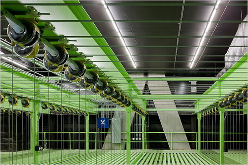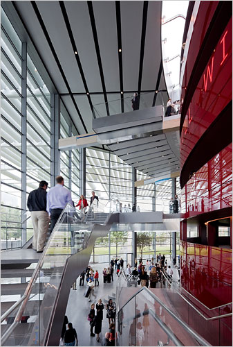 同時(shí),這幢建筑物不平坦的條紋形鋁質(zhì)表面,給人以單調(diào)的感覺(jué),它的外觀非常乏味。結(jié)果,這幢建筑物的引人激動(dòng)的地方,不是在表面的細(xì)節(jié),而在內(nèi)部的變化機(jī)制。