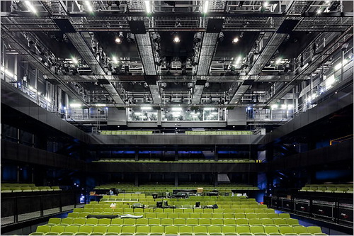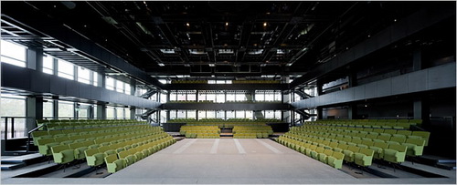 但起主要作用的是劇院大廳本身和支持它的體系。像舞臺(tái)布景的臺(tái)口墻,(proscenium wall)能夠自動(dòng)升高和下降。舞臺(tái)地板也能夠消失和重新出現(xiàn)。幾排樓座能夠按照多種形式和需要進(jìn)行布置。