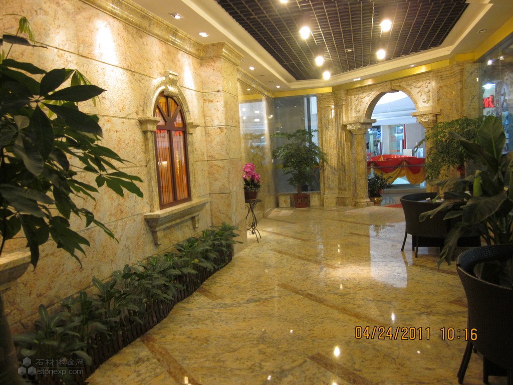 本案的室內(nèi)地面和室內(nèi)墻面全部采用拋光后的金鉆花麻來裝飾,整體效果好。墻面設(shè)計(jì)時利用了金鉆花麻的部分紋理變化,一眼望去,層層上升,節(jié)節(jié)遞進(jìn)。