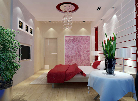 那又是什么樣的顏色在影響著面積對(duì)比呢?答案很明顯那一定是色相、純度和明度,主要依據(jù)則在于各種色彩的明度。同明度、純度的顏色中,含紅、橙、黃這些暖色傾向的色相,在可見光譜上處于長波一端的那些顏色,具有較強(qiáng)的放射感。相對(duì)于可見光譜波短一端的青、藍(lán)、紫色則由于其波長相對(duì)較短而帶有明顯的退縮感。而這一色彩心理原則運(yùn)用到室內(nèi)空間的實(shí)例中,恰恰可以解釋如果一客廳面積受客觀條件的制約,比較小。從客廳沙發(fā)到電視背景墻給人的視覺感受有壓迫感,那么我們必須運(yùn)用色彩原理拉長視覺距離。讓人的視覺感覺舒服、自然。我們可以適當(dāng)運(yùn)用感覺有退縮感的色彩拉大整體的空間距離,使用某些明亮的色彩裝飾物使之產(chǎn)生前進(jìn)感,突顯空間距離。此時(shí)應(yīng)盡量避免使用大面積的橫行肌理?xiàng)l紋,容易使人有壓迫感。適當(dāng)運(yùn)用透視空間或者錯(cuò)覺延伸空間作為背景墻。大面積色彩不能過分強(qiáng)烈,這樣容易使人產(chǎn)生緊張疲勞的視覺感受。如圖4所示,案例中,強(qiáng)烈的紅色從背景中突顯出來;而綠色的造型以及電視柜臺(tái)面上的裝飾物件更加拉大了前后空間距離。