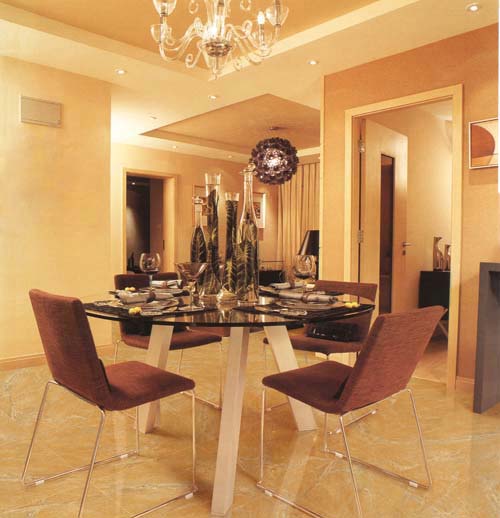 本案使用黃色石材拋光后裝飾廚房地面,與整套房子的整體風(fēng)格和色彩風(fēng)格 一致。