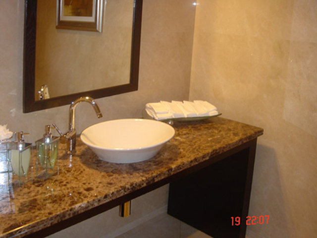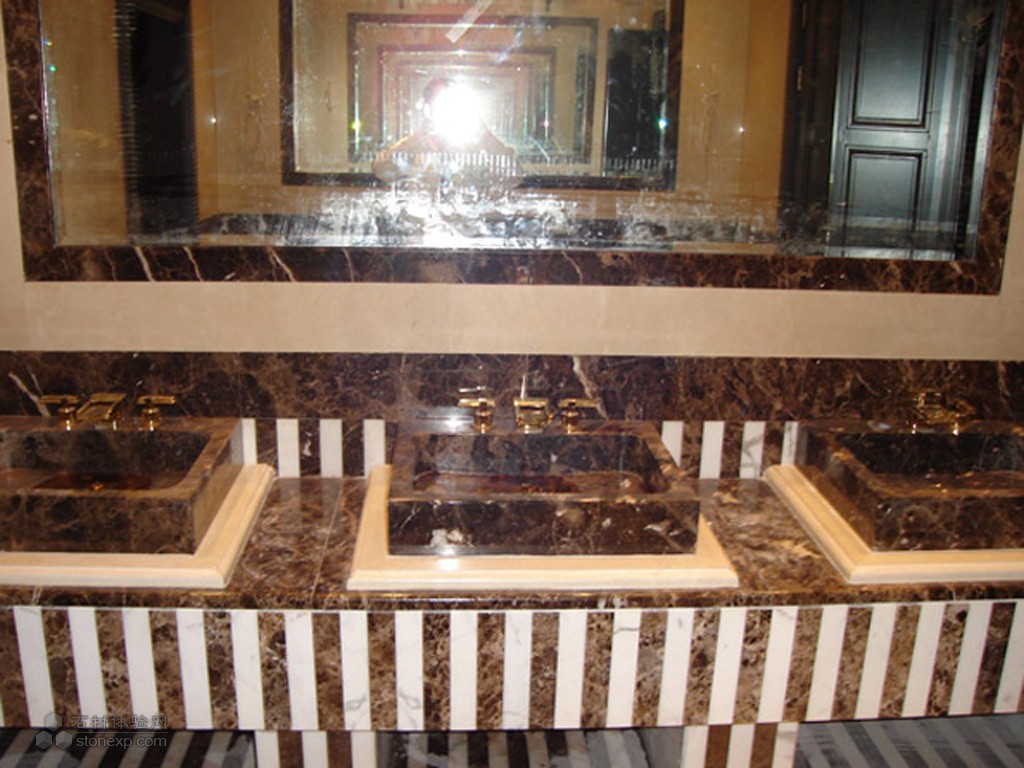淺啡網是一種進口大理石,被廣泛應用于別墅、酒店、市政工程等室內、室外裝修。 本案的洗手間設計,淺啡網應用于臺面板、方形洗手盆及鏡框邊緣。淺啡網的表面做過拋光處理,其自身的紋理在燈光的照射下,如同絲綢般輕柔。 了解2010年熱賣石材,點擊專題“2011年十四種熱賣石材品種”