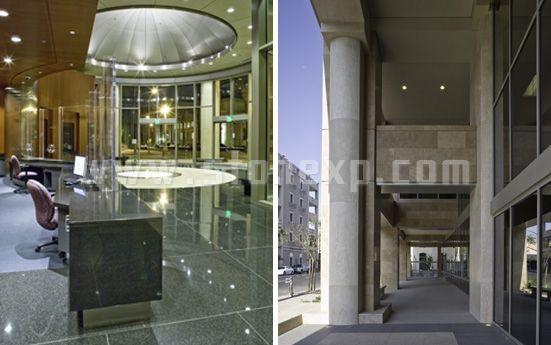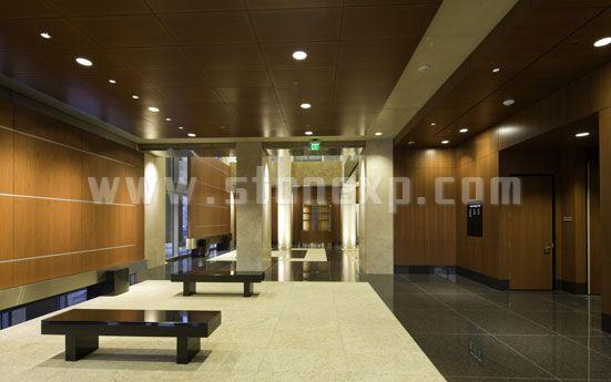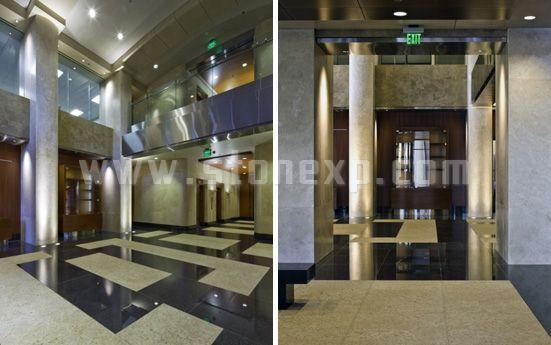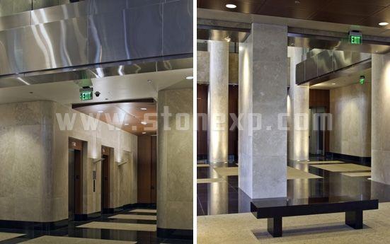 這座九層高的建筑是區(qū)律師事務(wù)所所在地,它是近二十年間在Riverside建起的第一座高層建筑。外圍的圓柱采用土耳其經(jīng)典洞石,內(nèi)部的墻面和地板結(jié)合使用了土耳其經(jīng)典深色洞石和土耳其經(jīng)典淺色洞。接待臺和大廳長椅則使用了Black Absolute花崗巖。