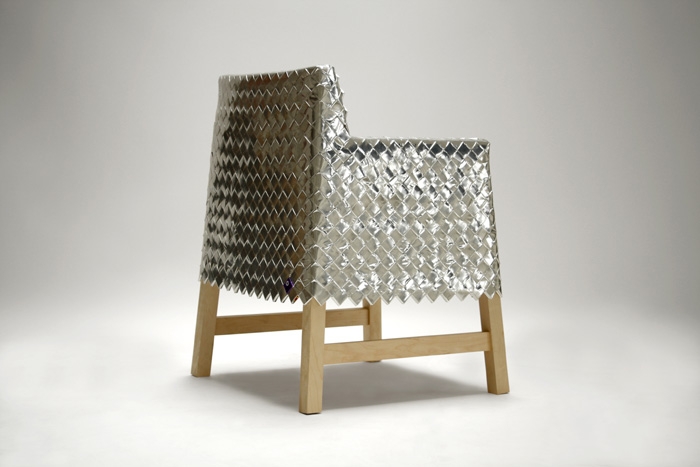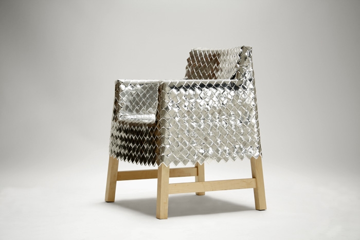 這是一款非常環(huán)保的椅子。椅子結(jié)構(gòu)是由PSC認(rèn)證的木材構(gòu)成。椅子外面那層皮是由廢棄的糖紙包裝做成。這些糖紙包裝因?yàn)橛∷㈠e(cuò)誤,標(biāo)簽不正確,或者過(guò)時(shí)了而不能使用。藝術(shù)家將他們使用到這里。糖紙包裝們被折疊組裝起來(lái),形成椅子外飾面。