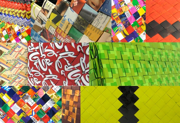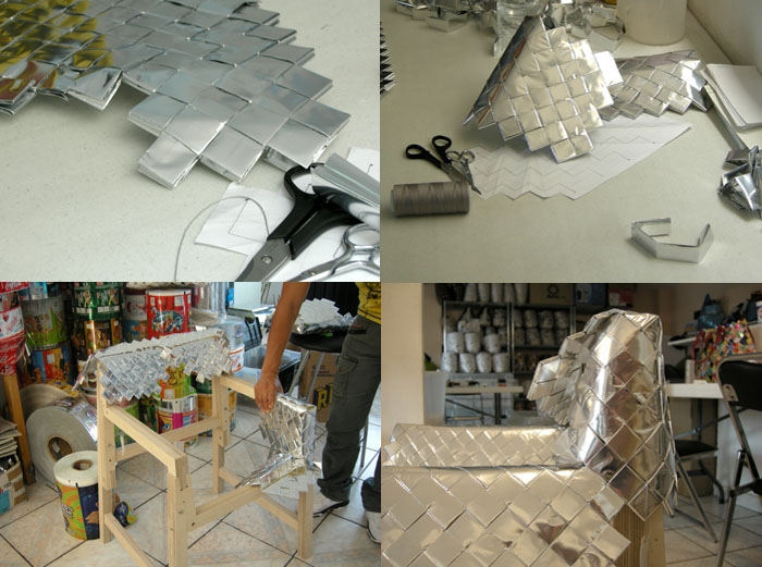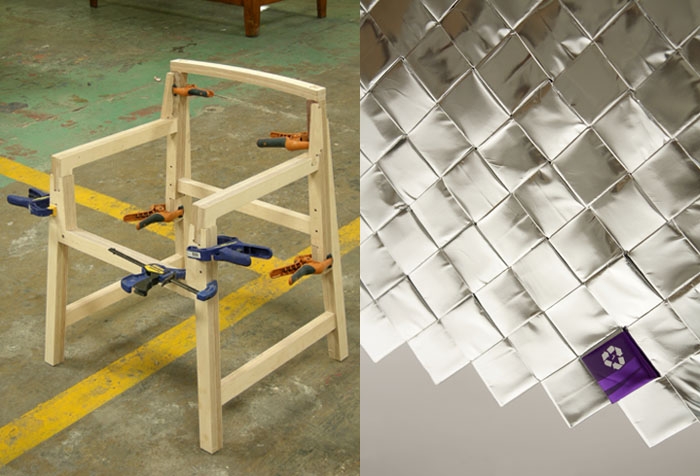 The second component is a cover that slips on top of the wooden structure and forms the seat, back and armrests that the user is in contact with. This cover is made using small pieces of post-industrial waste from the candy wrapping industry. Labels that are misprinted, or which feature incorrect or obsolete information, are recovered and cut into small sections, which are then folded into rectangular pieces and joined to form large surfaces. An internal reinforcement made from post-consumer recycled paper is used to give rigidity and resistance to the labels.