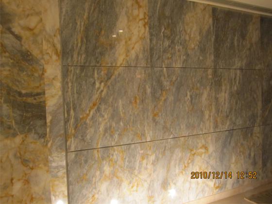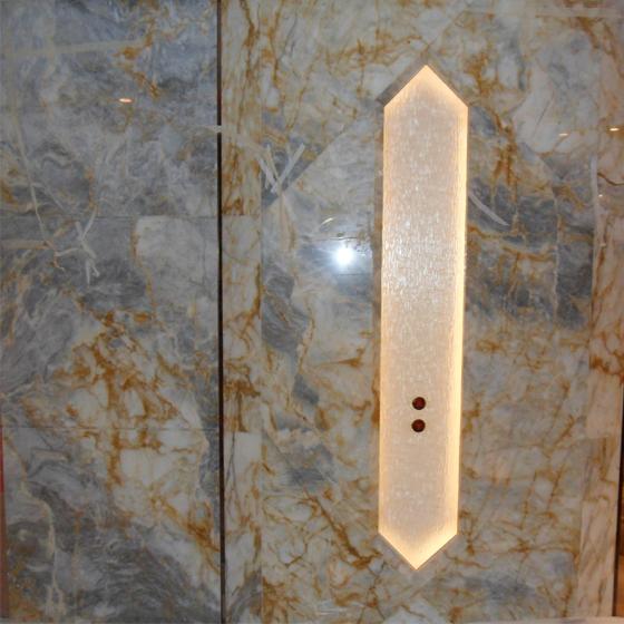 墻面使用特色石材裝飾,有著波濤灰和比薩灰的底色,類(lèi)似于金蜘蛛和索菲特金的金線遍布其上。