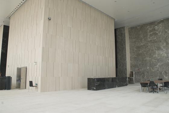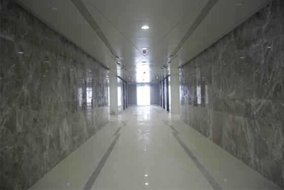 廣州佳兆業(yè)廣場(chǎng)走廊設(shè)計(jì),走廊一直往前延伸,墻面使用灰色石材,地 面大面積使用米黃類大理石,灰色石材使用水刀拼花工藝層層遞進(jìn),有 如風(fēng)動(dòng)后的水面,極富動(dòng)感。相關(guān)石材品種:摩托羅拉 、銀河玉 、銀鼎灰