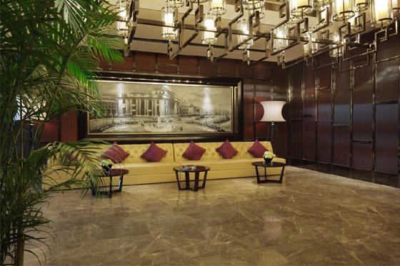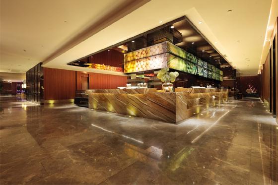 南京同慶樓的大廳吧臺(tái)設(shè)計(jì),充分考慮到石材本身的紋路。相關(guān)石材品種推薦:黑海玉、涅槃。