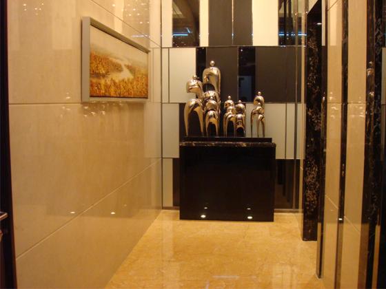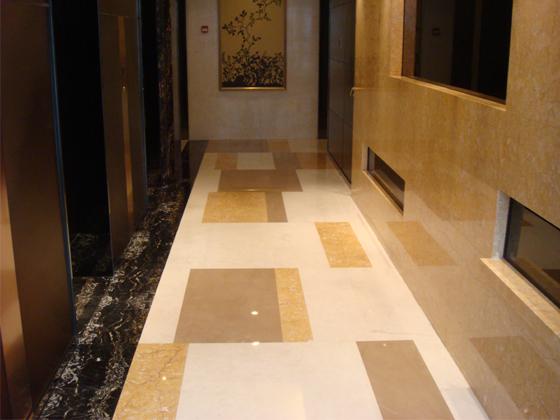 朱美拉公寓走廊地面,地面利用石材本身的色彩深淺變化組合成不同的圖案,邊線使用黑色石材,形成鮮明對(duì)比。相關(guān)品種推薦:象牙米黃、玫瑰米黃、黑金花