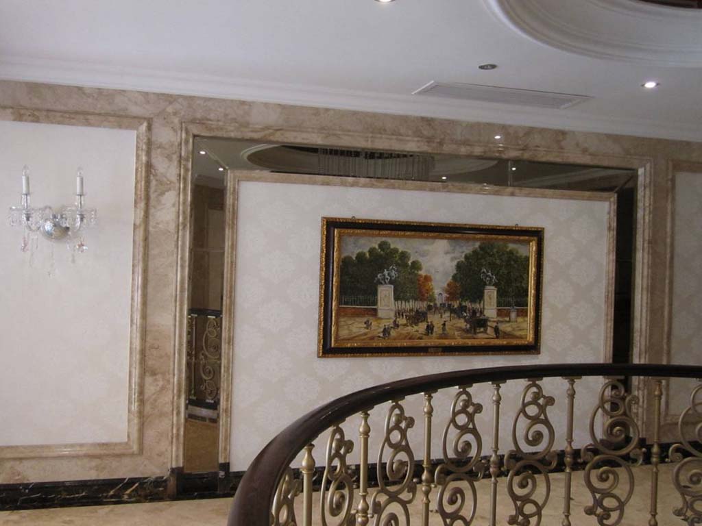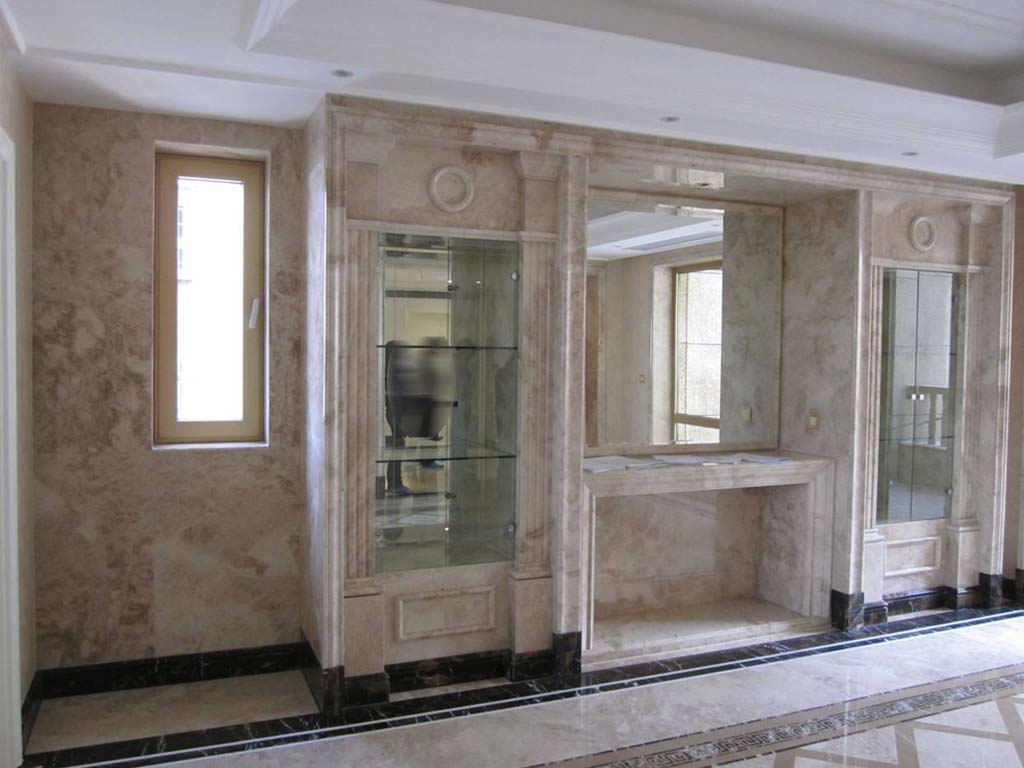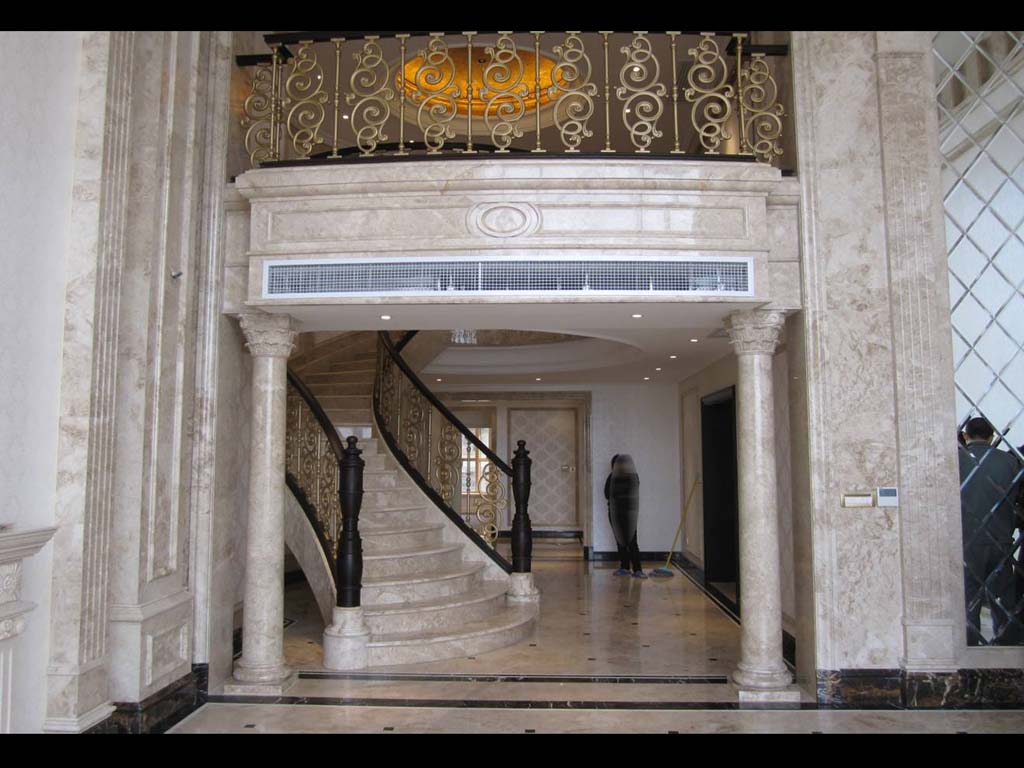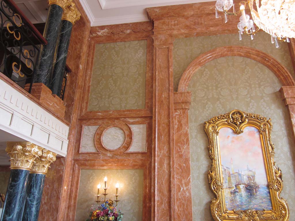 溫州外灘是環(huán)球石材集團(tuán)福建公司2011年加工的工程項目,其主要材料為古典米黃,用于裝飾室內(nèi)地面、室內(nèi)墻面、樓梯踏步、柱子。客廳墻面的紅色石材為橙皮紅,室內(nèi)柱子和大廳墻面石材為圣羅蘭