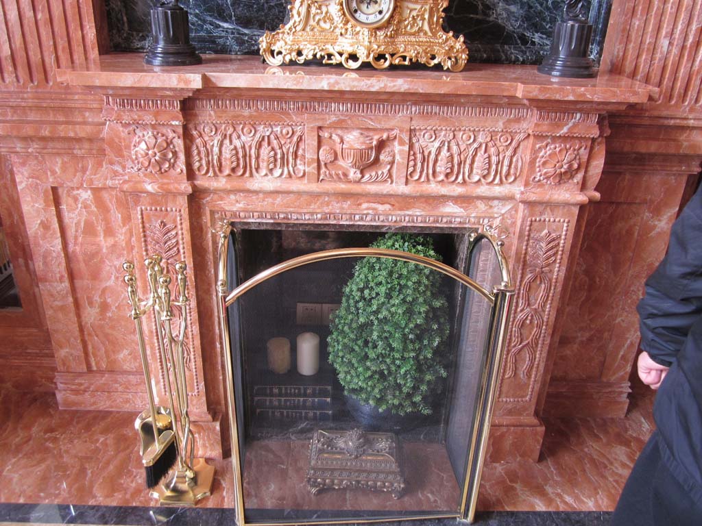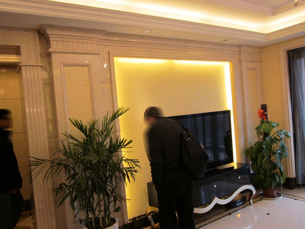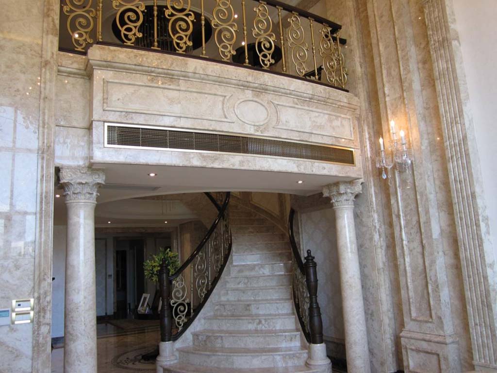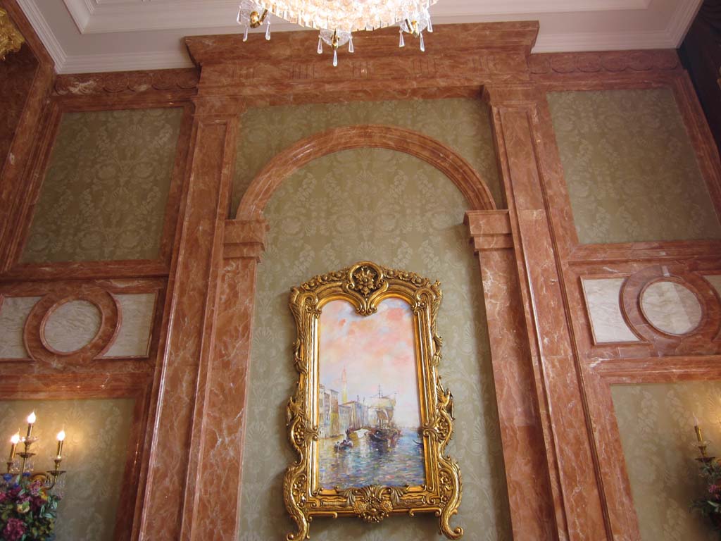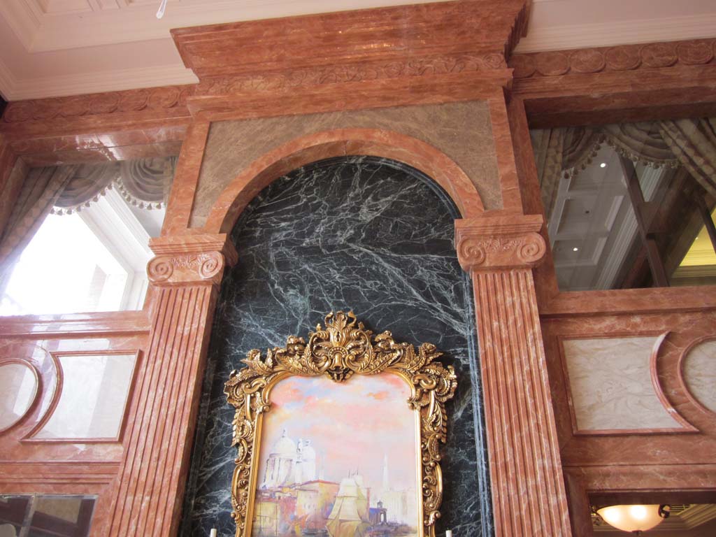 溫州外灘是環(huán)球石材集團(tuán)福建公司2011年加工的工程項目,其主要材料為古典米黃,用于裝飾室內(nèi)地面、室內(nèi)墻面、樓梯踏步、柱子。客廳墻面的紅色石材為橙皮紅,室內(nèi)柱子和大廳墻面石材為圣羅蘭