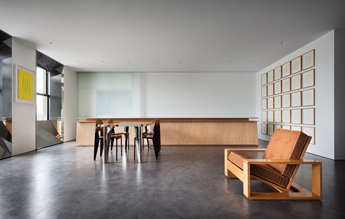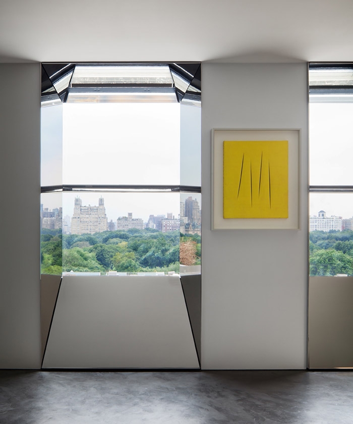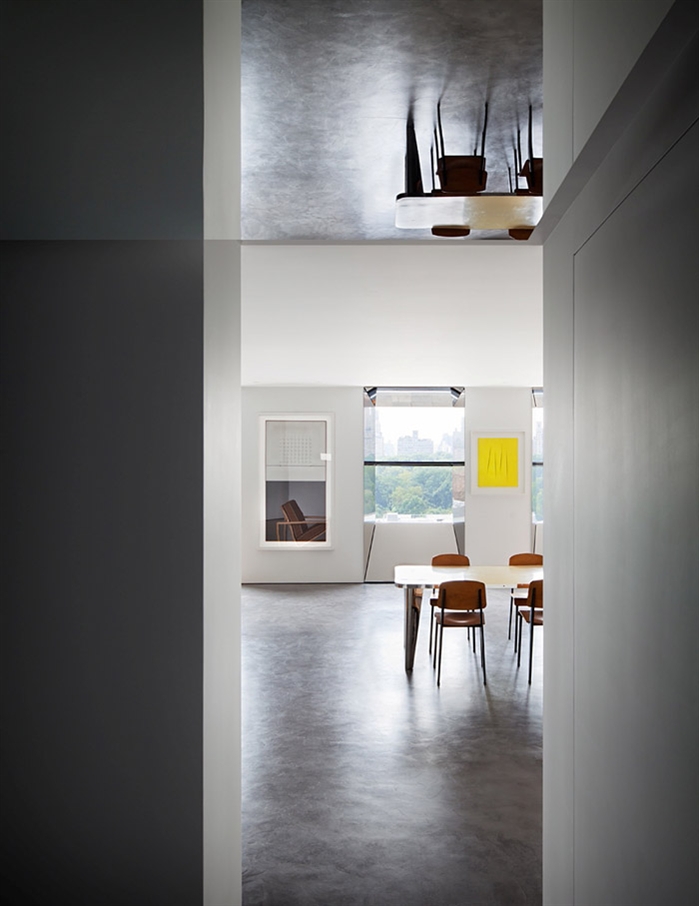 這個大公寓的內(nèi)裝設(shè)計,超越了世俗裝修,非常優(yōu)雅,整體,還帶點(diǎn)失重感??臻g中生動的Ludio Fontana所畫的黃色油畫,Thirty Agnes Martin畫的版畫(框子是Donald Judd手工做的),還有Jean Prouvé的桌子,與整體混合形成一幅生動的景象,就像是一曲洪亮,明晰,極簡派的旋律。