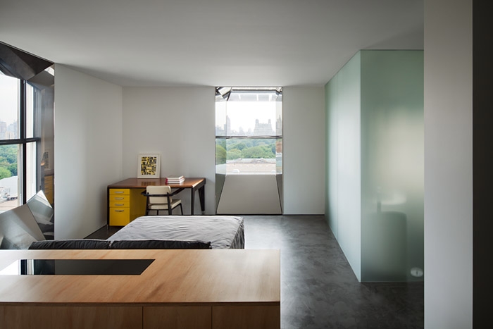 獨(dú)特的窗框和反光天花板使得一切更像是藝術(shù)品。公寓主要是兩個房間,一個包含廚房餐廳的大客廳和一個臥室。家具都是低矮的矩形,在有著功能作用的時候也幫忙劃分空間。家具是由蘋果木膠合板制成。每一個家具都像雕塑一樣美麗。即便是浴室,在半透明的玻璃劃分下,也呈現(xiàn)出無形的氣質(zhì)。