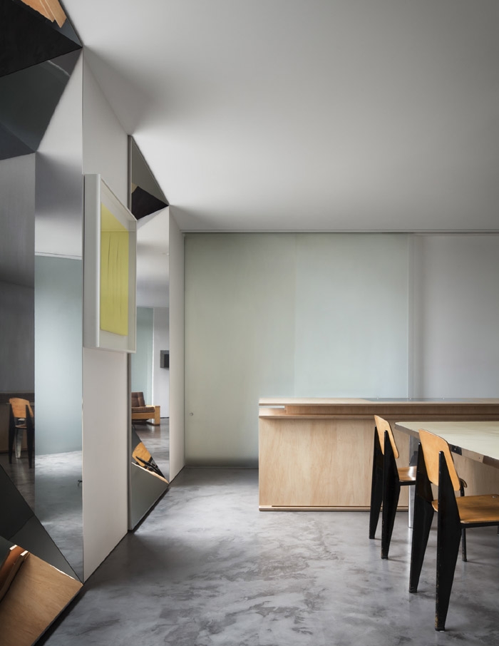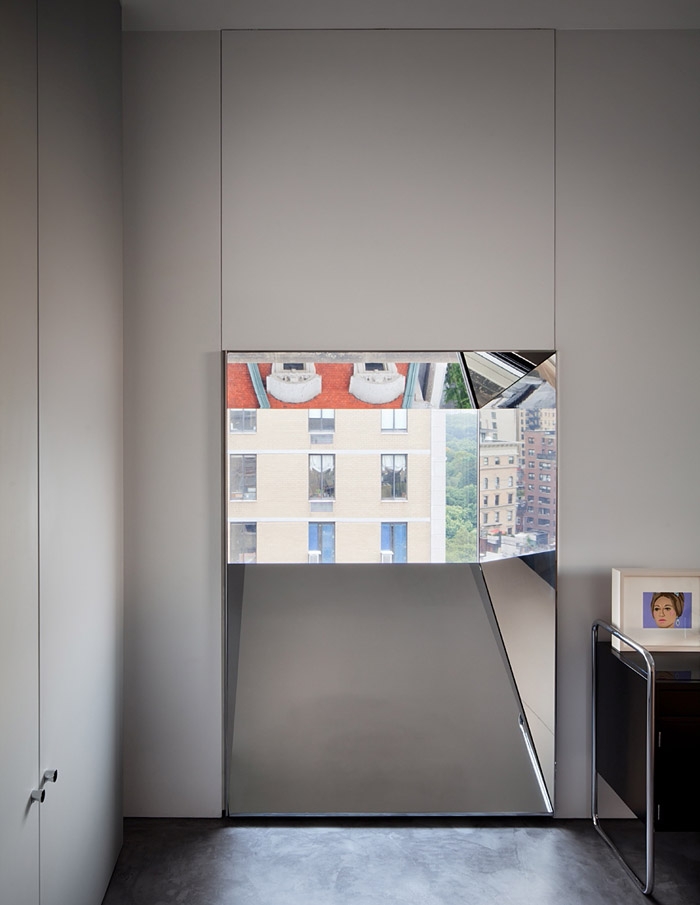 窗口被奇異的拉長,傾斜拼接,附上鏡面拋光不銹鋼,這些發(fā)亮邊界的材料從舊的畫框上回收。堅實(shí)的墻上被嵌入了這些不銹鋼,就像安裝上了潛望鏡,可以看到天空的反射,路面的反射,周圍的反射。房間有了更多的變化性,更多的立體派視覺解構(gòu)復(fù)雜性。但更重要的是,這些邊緣使得空間放大,開放,并平衡模糊掉透明性和反射性。