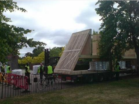瑞士建筑師彼得-卒姆托(Peter Zumthor)設(shè)計(jì)的“蛇形藝?yán)?rdquo;(Serpentine pavilion)的第一部分,于5月26日早上,由平板拖車運(yùn)抵倫敦肯辛頓公園的安裝現(xiàn)場(chǎng)。