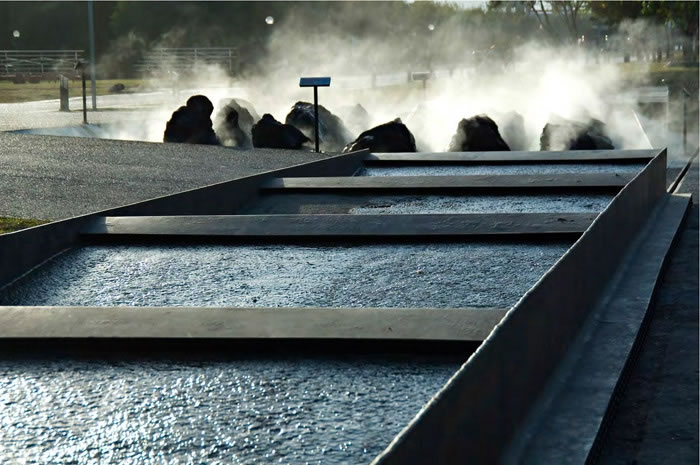 以前的運(yùn)輸軌道進(jìn)行視覺(jué)化聯(lián)系。盡頭的一側(cè)設(shè)置了大塊巖石和噴霧噴泉,這在炎炎夏日給游客帶