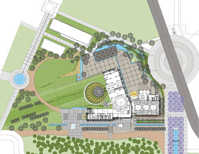 the rain garden in the landscape beyond. At the museums entrance, the stepped canal