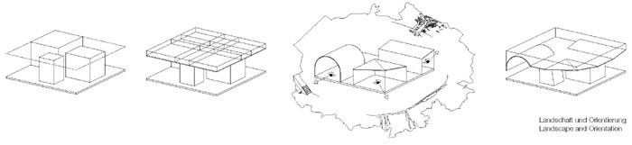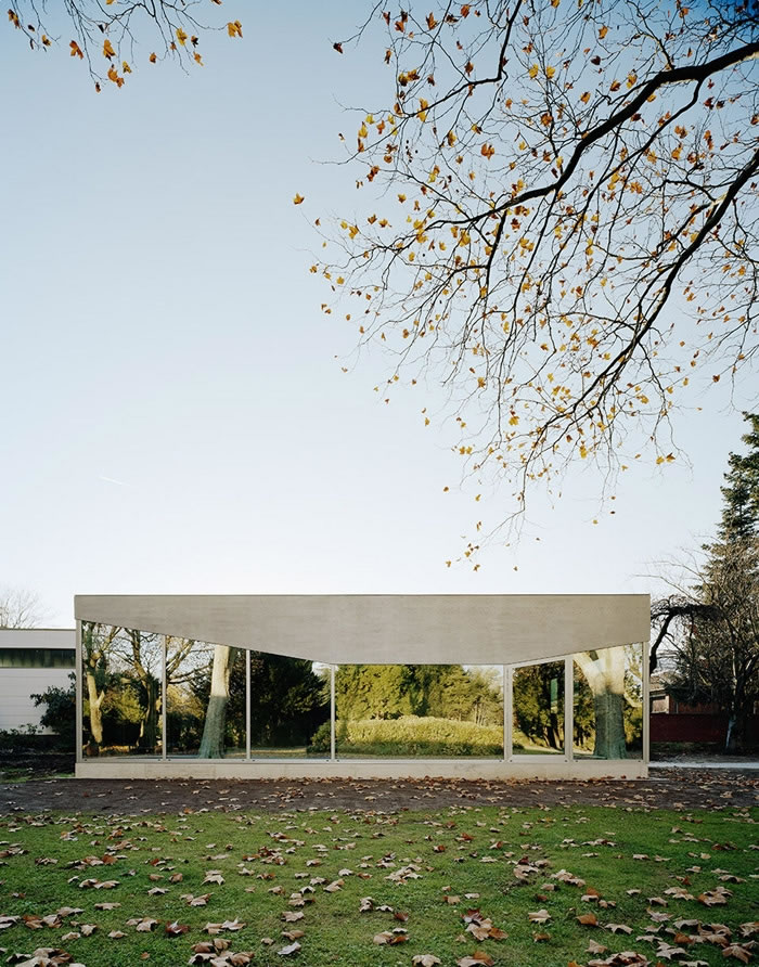 The architecture of the pavilion unfolds out of a neutral, nondescript,