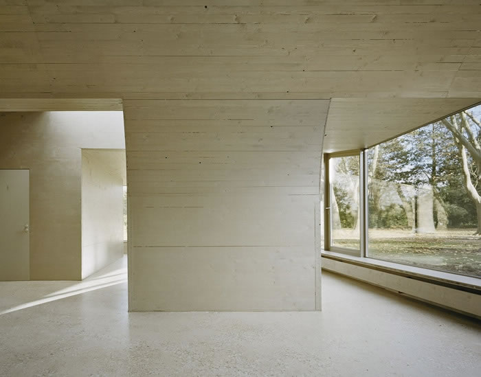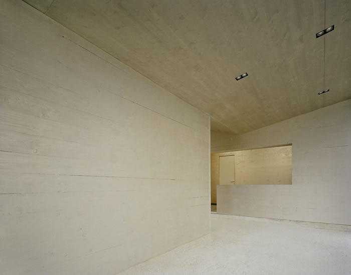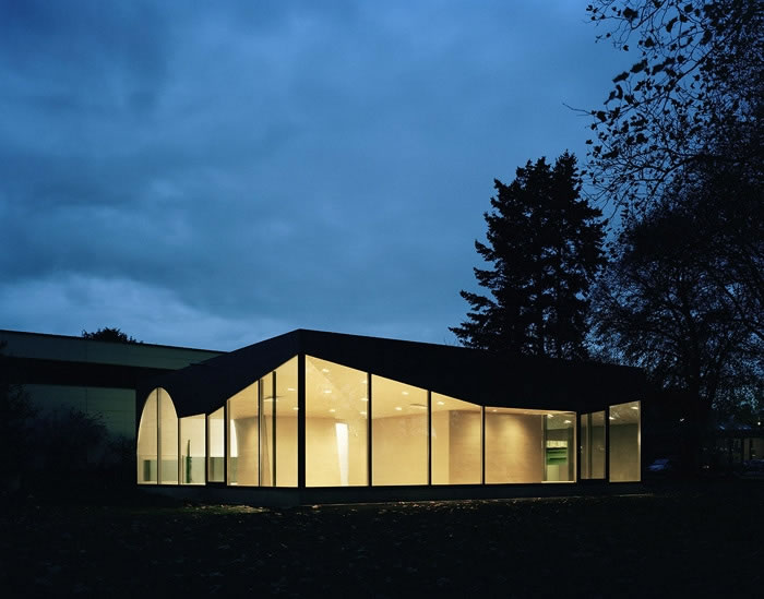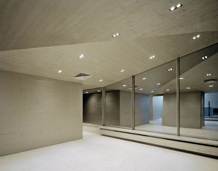建筑師應(yīng)用簡單的材料,給予建筑清晰獨(dú)特的形象。利用阿爾卑斯山白云石和水泥制作出的水磨石地板,清新活潑。木材構(gòu)成內(nèi)部的墻壁和天花,使空間均勻整體。屋面吊頂使用木材框架,包含通風(fēng)管道。高反射玻璃在一天的變化中與周圍景觀互動(dòng)明顯,將周圍景觀反映折射。但是到了晚上,室內(nèi)燈光亮起,玻璃變得透明,與白天截然不同。