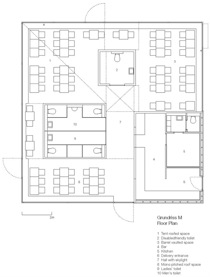 建筑的構(gòu)架與地面關(guān)系非常獨(dú)特,看起來像是插入了三個(gè)卷,卷內(nèi)包含服務(wù)設(shè)施,同時(shí)將空間分為三個(gè)區(qū)域,這里就是營業(yè)的區(qū)域。這三個(gè)區(qū)域的天花集結(jié)起來形成一個(gè)大的,宛如帳篷的,多面,連續(xù),流動(dòng)屋頂,將整個(gè)營業(yè)區(qū)統(tǒng)一為一個(gè)整體感很強(qiáng)的空間,并提空面對周圍公園的豐富視野,還能看見頭頂?shù)乃{(lán)天。