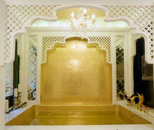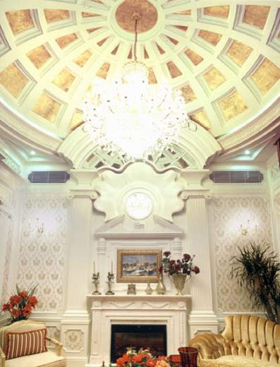 高浮雕的科林斯柱和希臘拱門,把客廳的希臘風(fēng)格刻畫得惟妙惟肖,宗教意味濃重的鋼結(jié)構(gòu)圓頂設(shè)計(jì)配合挑高的客廳拉伸了人們對(duì)空間感知,這也是宗教建筑給人一種釋放的感覺(jué)的原因。色彩搭配方面設(shè)計(jì)師選用了金與紅,把水彩畫特有的清爽神俊,濃淡相宜,具備瀟灑風(fēng)雅的格調(diào)體現(xiàn)出來(lái)。