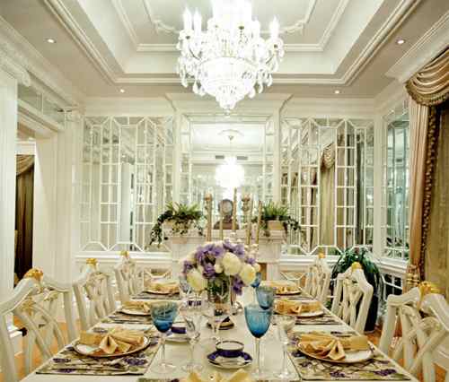 讓我們來(lái)欣賞一下餐廳,大面積的鏡子使用放大了餐廳的空間。傳統(tǒng)的歐式長(zhǎng)桌、高背椅搭配田園風(fēng)格的餐具在水晶吊頂?shù)挠骋r下古樸但不失華貴。