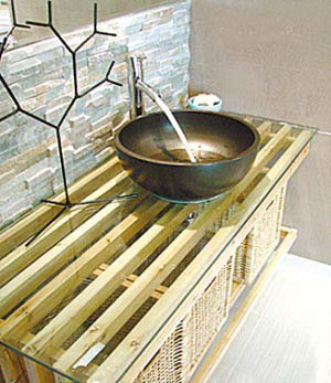 3招創(chuàng)意為廚衛(wèi)家居增色。衛(wèi)生間的干濕分區(qū),造就了木質(zhì)的浴室柜“登堂入室”。這個(gè)浴室柜展現(xiàn)的是一種自然而簡(jiǎn)樸的魅力。木方打造的框架,清玻臺(tái)面,中間放幾個(gè)隨處可以買到的藤籃,簡(jiǎn)單、實(shí)用,有一種通透的美感。
