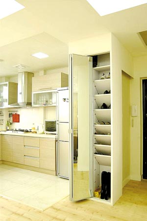 這里把廚房的墻打掉,做成了開(kāi)放式廚房,為的是增大廚房的使用空間。但是廚房的位置剛好在大門旁,沒(méi)有了墻,鞋柜怎樣放呢?設(shè)計(jì)師把其中的一面墻做成柱式的鞋柜,鞋柜門還增加了一面全身鏡,讓主人在出門前可以整理儀容。這樣一來(lái),廚房增大了,鞋柜有了,還有一面穿衣鏡,可以說(shuō)是一舉三得。