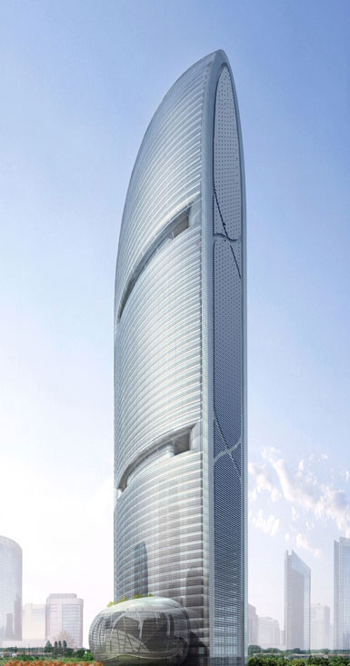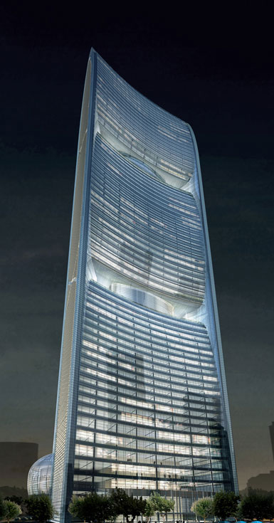 這座230萬平方英尺的大廈已經(jīng)在上周日封頂,并計劃在今年年末完工。它采用了最新的可持續(xù)技術和工程設備。鋼和結構混凝土支撐了建筑的曲線外形,并抵擋了風力和地震負荷。根據(jù)SOM的說法,一個結構上的創(chuàng)新是結合了風力渦輪。這些渦輪以立面上的漏斗狀開口進風,并通過樓板支撐,從側(cè)面又頂住了上面的樓層。