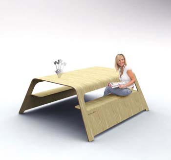 這款餐桌看起來就像是用一塊單獨的木片制成,然后在再兩邊摳兩個洞,將木片折進去,就成了椅子。給人很強的視覺沖擊。當然,實際的工藝會復(fù)雜得多。